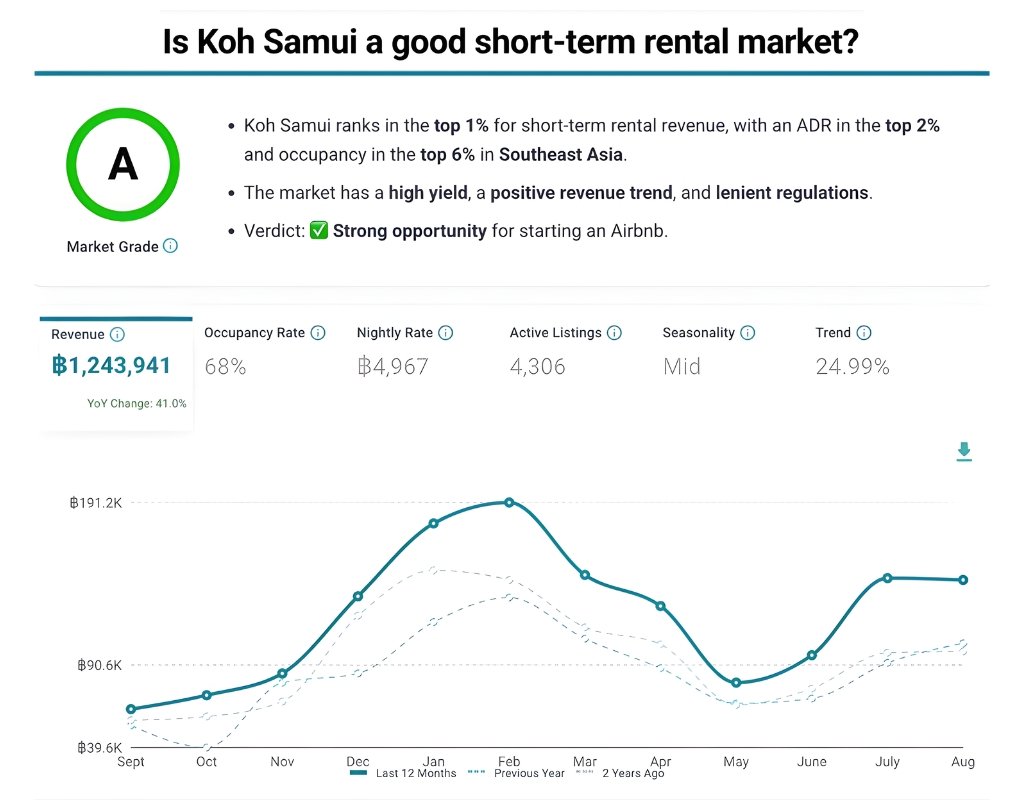 Koh Samui remains one of Thailand’s most profitable destinations for short-term rentals. Strong demand, high revenues, flexible regulation